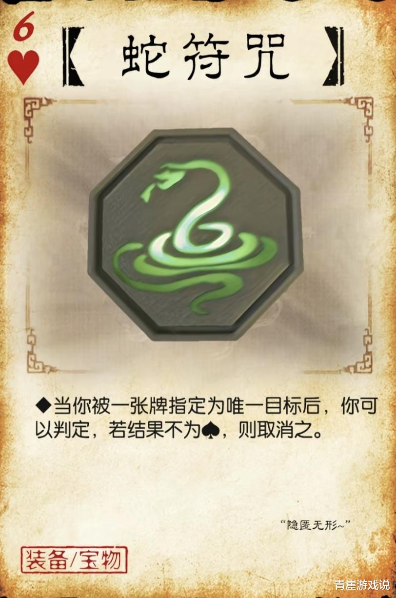 蛇符咒的能力是隐身,最大的特点就是防御力接近无解。三国杀的蛇符咒在成为单一用牌目标时,可以进行判定,若判定结果不为黑桃,则取消。蛇符咒有夸张的防御效果,理论上免疫百分之75的单目标卡牌!装上蛇符咒,运气好了想掉血都难,可以称为极致的防御!
