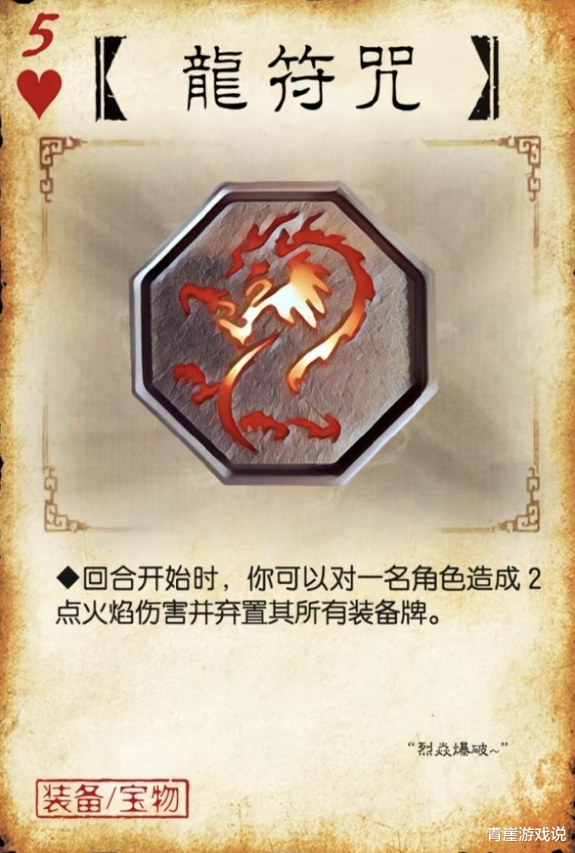 龙符咒的能力是爆破,能指定位置进行烈焰轰炸。三国杀龙符咒是杀伤能力最强的符咒,且没有之一。它能对一名角色造成两点火焰伤害并且卸下其所有装备。简单粗暴,但能造成的收益却相当可观,龙符咒永远是最逆天的,完完全全的数值怪物!