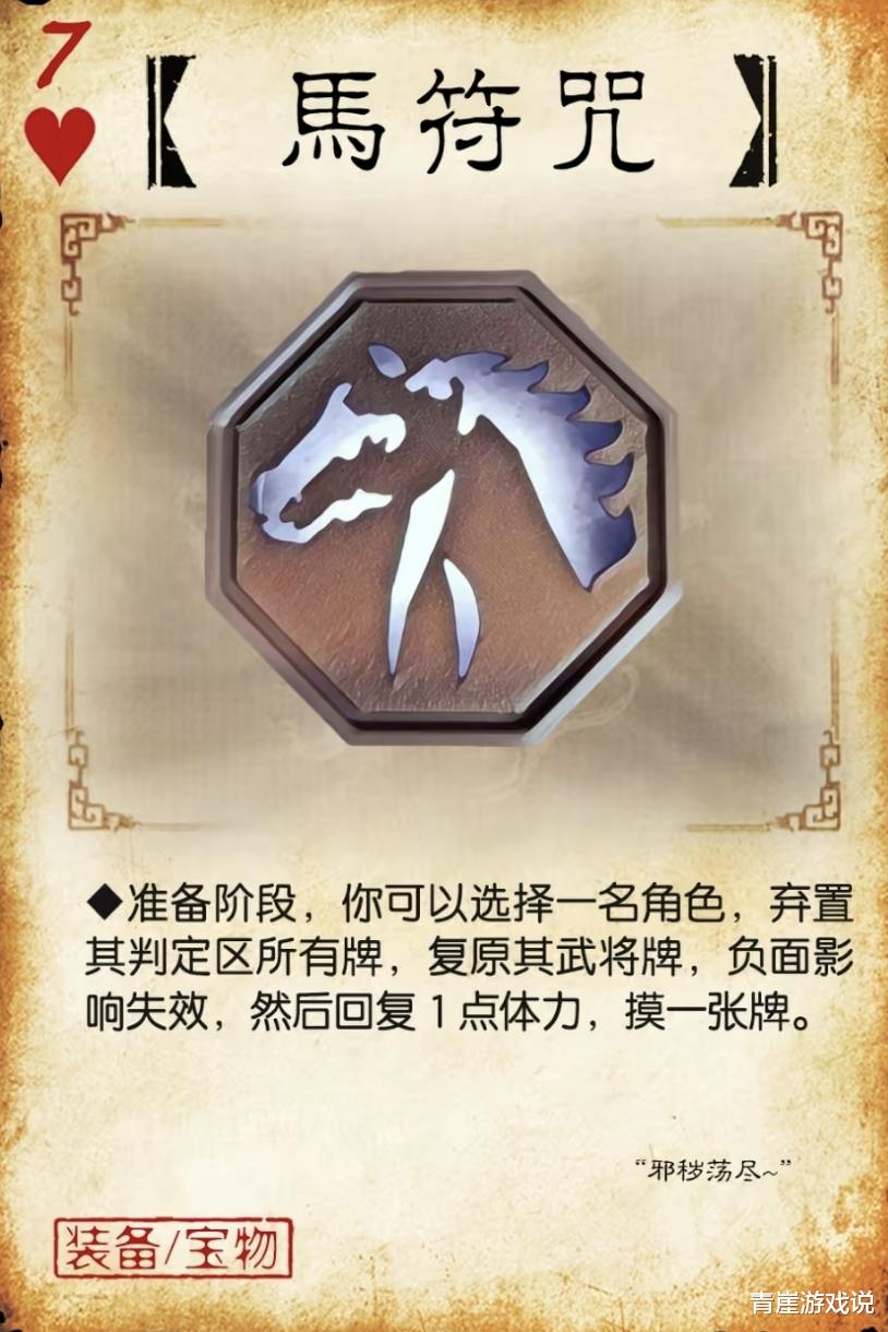 马符咒的能力是治疗,任何伤残、疾病都能瞬间治愈。三国杀马符咒能对一名角色清除所有负面效果、回复一点血量并摸一张牌。马符咒的招牌是回复,附带效果虽然可以一次性清除所有负面效果,但一般情况下一个角色没有这么多负面buff,因此无法将它的能力发挥到极致……