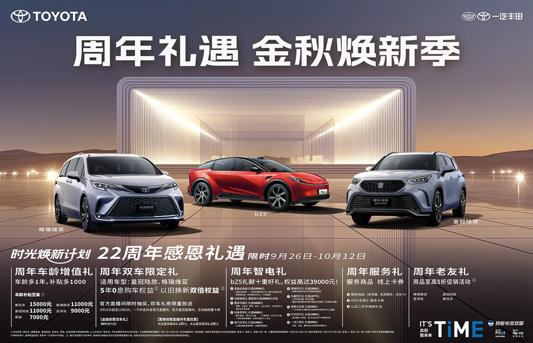 9月是一汽丰田的生日月,22年前,一汽丰田拔锚启航,开启了壮阔的发展篇章。22年间,一汽丰田累计赢得1200万用户的信赖,积累了今天应对产业变革的巨大资产;9月自然也就成了一汽丰田的“客户回馈月”。