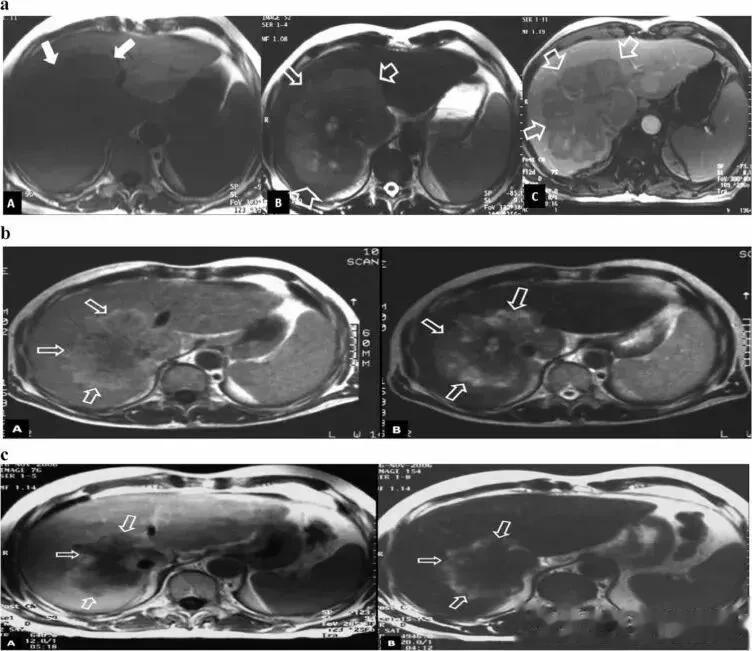 (a)接种前影像学研究。T1-w(A)、T2-w(B)和增强 T1-w(C)轴向磁共振 (MR) 图像显示肝肿瘤的初始大小(箭头)。(b)6 个月的影像学随访研究显示 T1-w(A)和 T2-w(B)轴向 MR 图像上的病变尺寸均缩小(箭头)。(c)10 个月的影像学随访研究显示 T1-w(A)和 T2-w(B)轴向 MR 图像上的病变尺寸进一步缩小(箭头)。