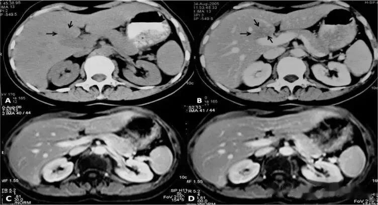 接种前平扫(A)及增强扫描(B,静脉注射造影剂的门静脉期)轴向CT图像显示门静脉前方低密度病灶(箭头)。治疗后(1年后)相同解剖层面的增强T1-w磁共振连续图像(C、D)显示肝实质外观正常。