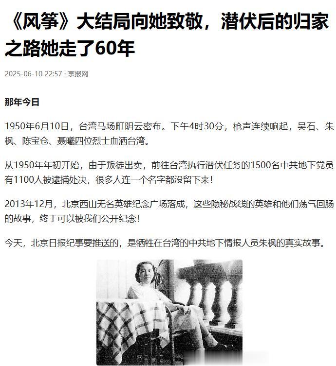 遗憾的是,朱枫虽然成功飞到了舟山,离大陆只有一步之遥,却因为蔡孝乾供出的线索,还是被特务抓了回去,押回了台湾。