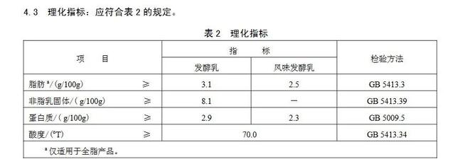 《发酵乳》标准规定的蛋白质、脂肪指标。 标准截图