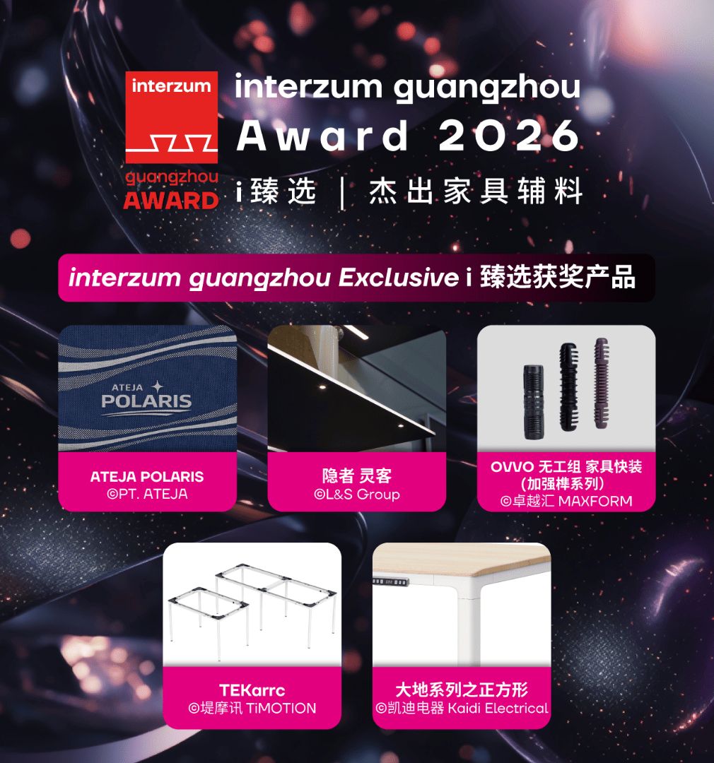 本届获奖产品将于2026年3月28-31日,在中国广州国际家具生产设备及配料展览会(CIFM / interzum guangzhou)现场特设的「interzum guangzhou Award展示区」(广州琶洲·广交会展馆C区,14.1馆C02)展出。获奖企业还将在展会首日的颁奖典礼上接受荣誉表彰,诚邀全球业界人士亲临现场,共襄行业盛宴。