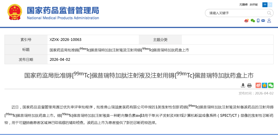 近日,国家药监局批准广东佛山瑞迪奥医药有限公司申报的锝[99mTc]佩昔瑞特加肽注射液及制备该药品的注射用锝[99mTc]佩昔瑞特加肽药盒上市,用于可疑肺癌患者区域淋巴结转移的辅助检查。