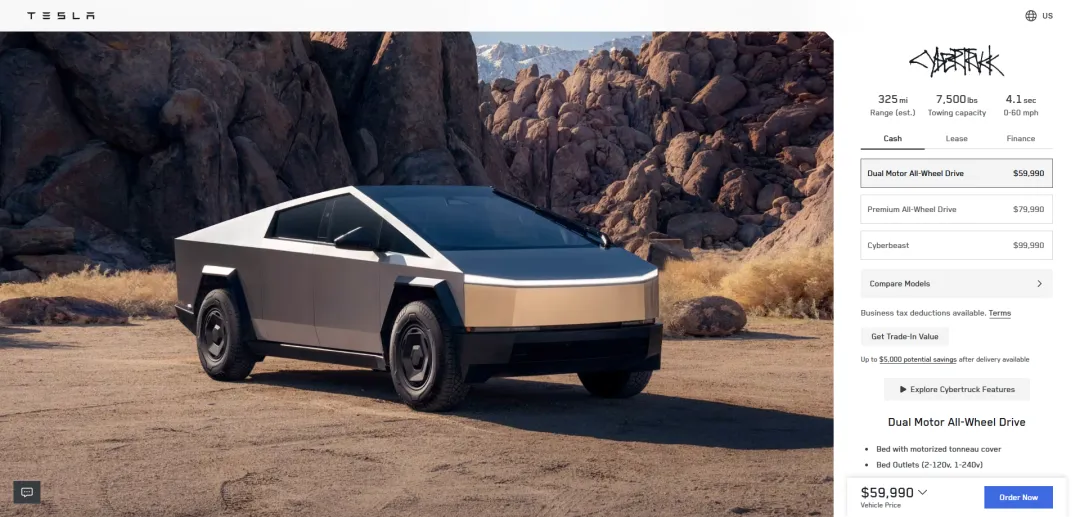 59990 美元的 Cybertruck 主要取代了此前因销售不佳被取消的后轮驱动版,成为目前该系列中的「入门级」车型。