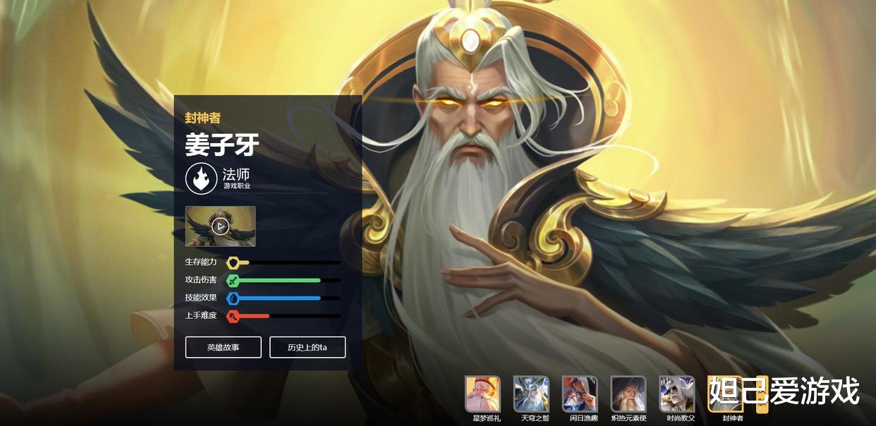 从剪影细节来看,该皮肤身着宽大道袍,脸部线条更像是胡须,再加上似有若无的法杖轮廓,所有线索都指向一个英雄,那便是常年处于T3的冷门法师——姜子牙。