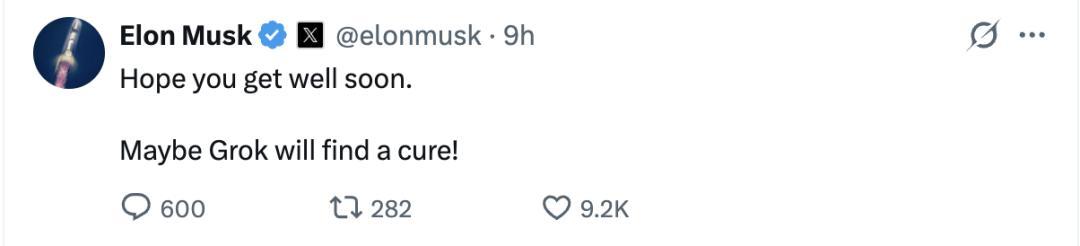 推文发布后,老板马斯克也第一时间留言慰问,祝他早日康复,并顺手cue了一下Grok:
