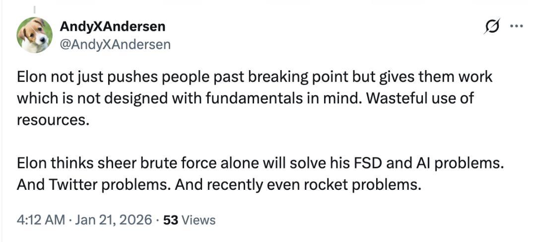 马斯克不仅把人逼到崩溃边缘,还经常让大家做一些没有遵循基本原理、从一开始就设计不合理的工作,导致资源被大量浪费。他认为只要靠蛮力就能解决FSD和AI的问题,也能解决Twitter的问题,最近甚至连火箭的问题也是如此。