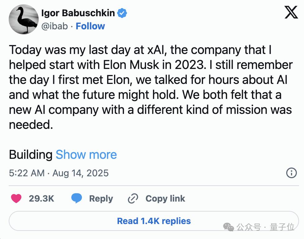 这是继Igor Babuschkin(25年8月)、Christian Szegedy(25年2月)、Kyle Kosic(24年4月)等大佬离职后,又一位离开的xAI联创。
