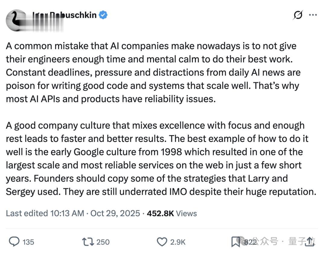 许多AI公司未能给工程师足够的时间和心态去做出最好的工作,导致代码和系统不可靠。良好的公司文化,注重卓越、专注和足够休息,能带来更好的成果。早期Google就是这种文化的典范,创始人们应该借鉴他们的策略。