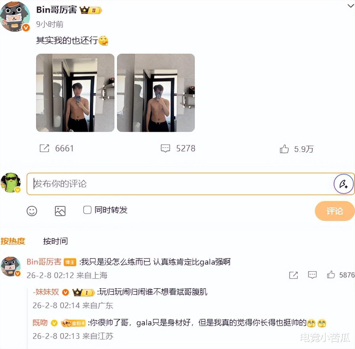更有趣的来了,在Gala晒出八块腹肌照片之后,Bin竟然也开始了,直接硬刚Gala,凌晨晒出了自己的一块腹肌照,这是翻来覆去睡不着吗,被Gala的身材刺激到了?必须比一比了?