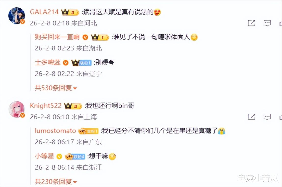 对于Bin的这波晒照,Gala还进行了回复,夸奖Bin是有天赋的。除了说Gala人真好之外,还能说什么呢,这都要夸Bin大哥,可以的,难怪和队友们关系都很好。
