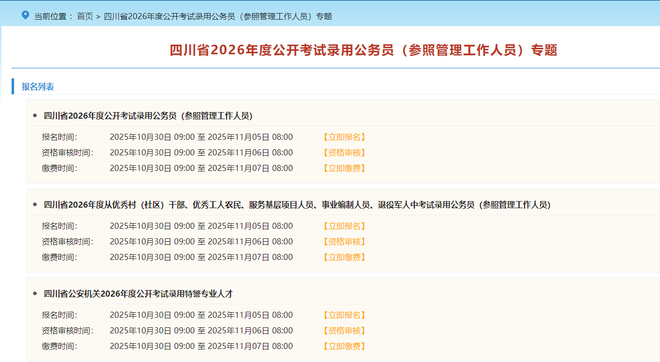 2026年四川省公务员考试职位表正式发布啦!全省计划招录12628人,相比2025年的11946人,实现小幅扩招,给广大考生带来了更多机会。报名通道将于10月30日8:00至11月5日18:00开放,考生可登录“四川省人力资源和社会保障厅”官网,点击进入公务员考试专题网站完成报名。