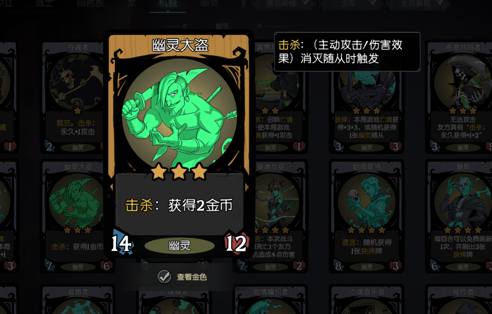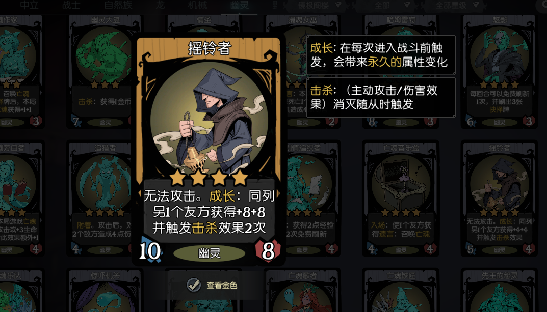 这套阵容还是延续之前版本击杀流的思路,需要拿到幽灵大盗才能开始玩,最主要的是这个版本有了一张新卡“摇铃者”无法攻击。成长:同列另一个友方获得+4+4并触发击杀效果。这就让击杀也可以在非战斗回合触发了,还是成长效果,这就给了我们很大的操作空间了。