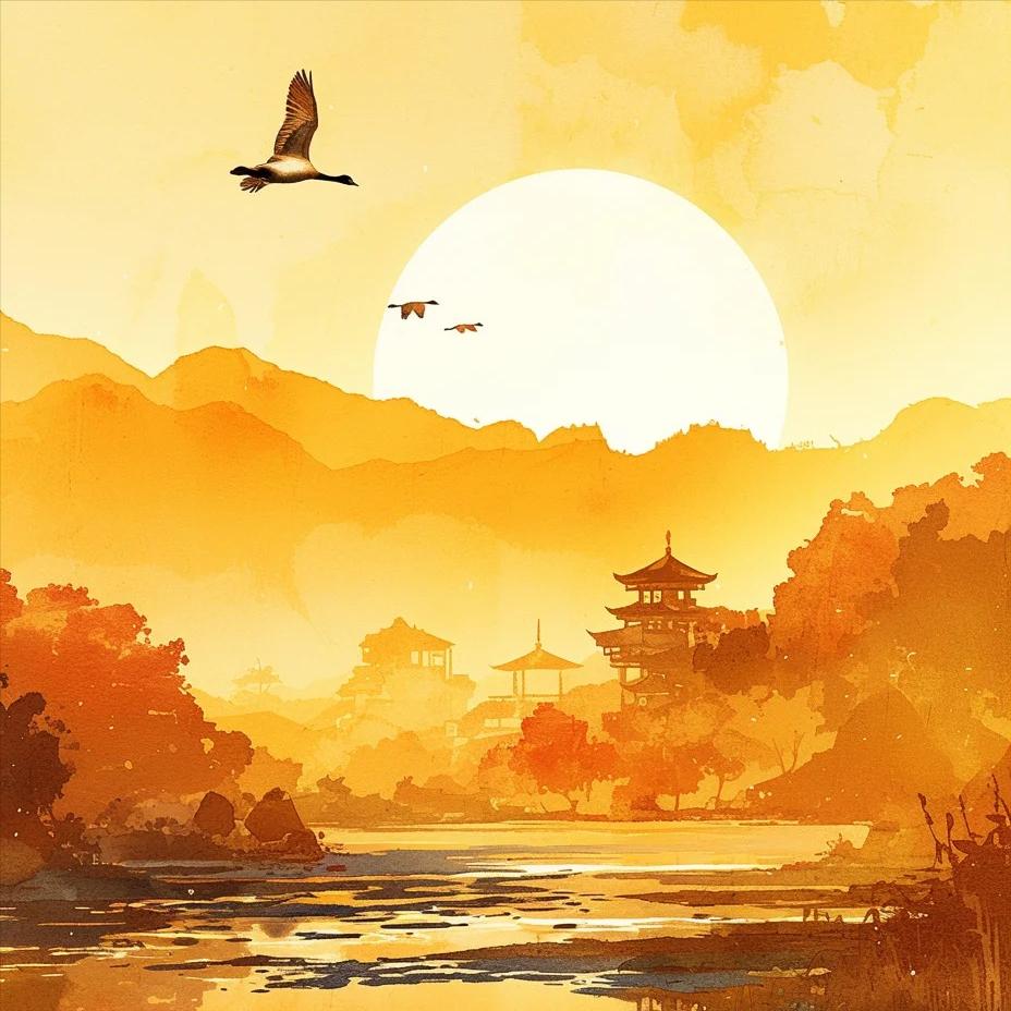就在这宁静而略带伤感的时刻,忽然看见一行沙洲上的大雁振翅飞起。