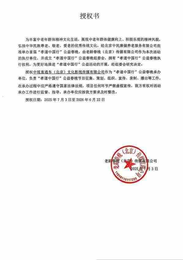 2025年6月23日,中视直通车与老龄春晚签署协议,共同运营“孝道中国行”公益春晚,意图打造一个具有广泛社会影响力的老年文化公益品牌。协议明确,老龄春晚作为发起方、主办方及运营方,需支付基础运营费用以保障活动执行;中视直通车则全面负责项目的策划、宣传、节目征集、录制播出等具体工作。
