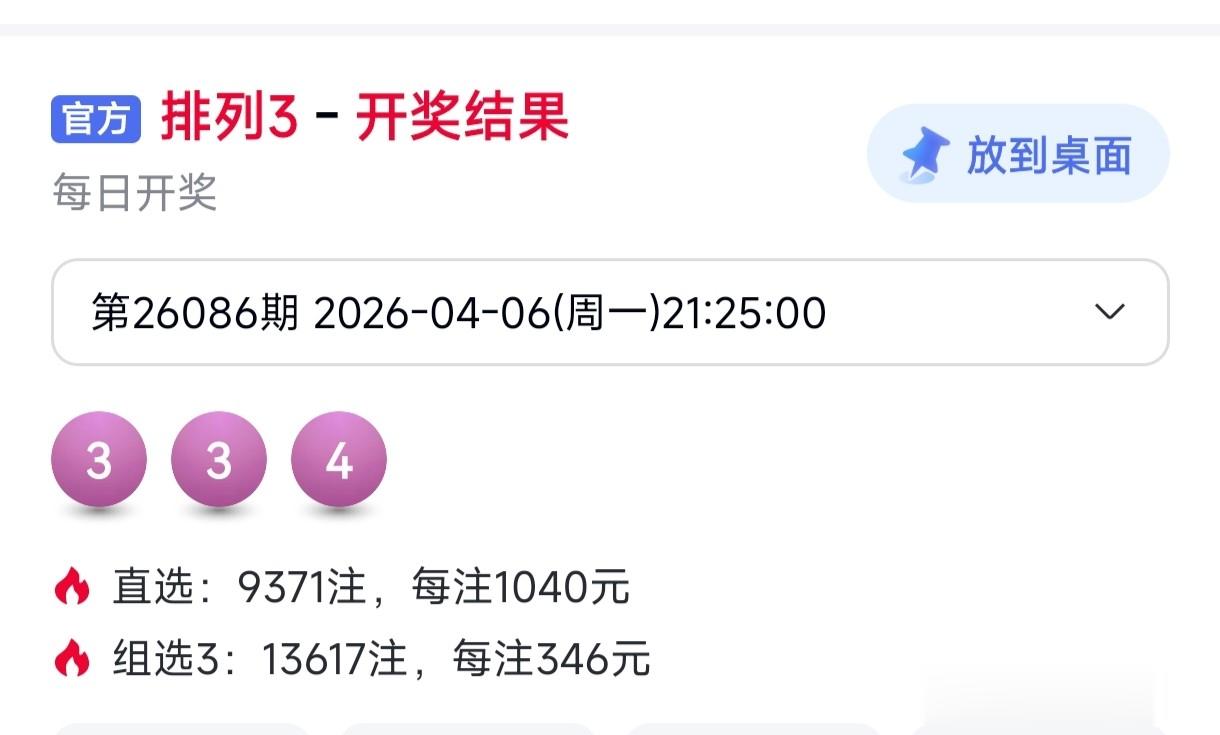 开奖快讯排列三26086期开奖号码为:3 3 4