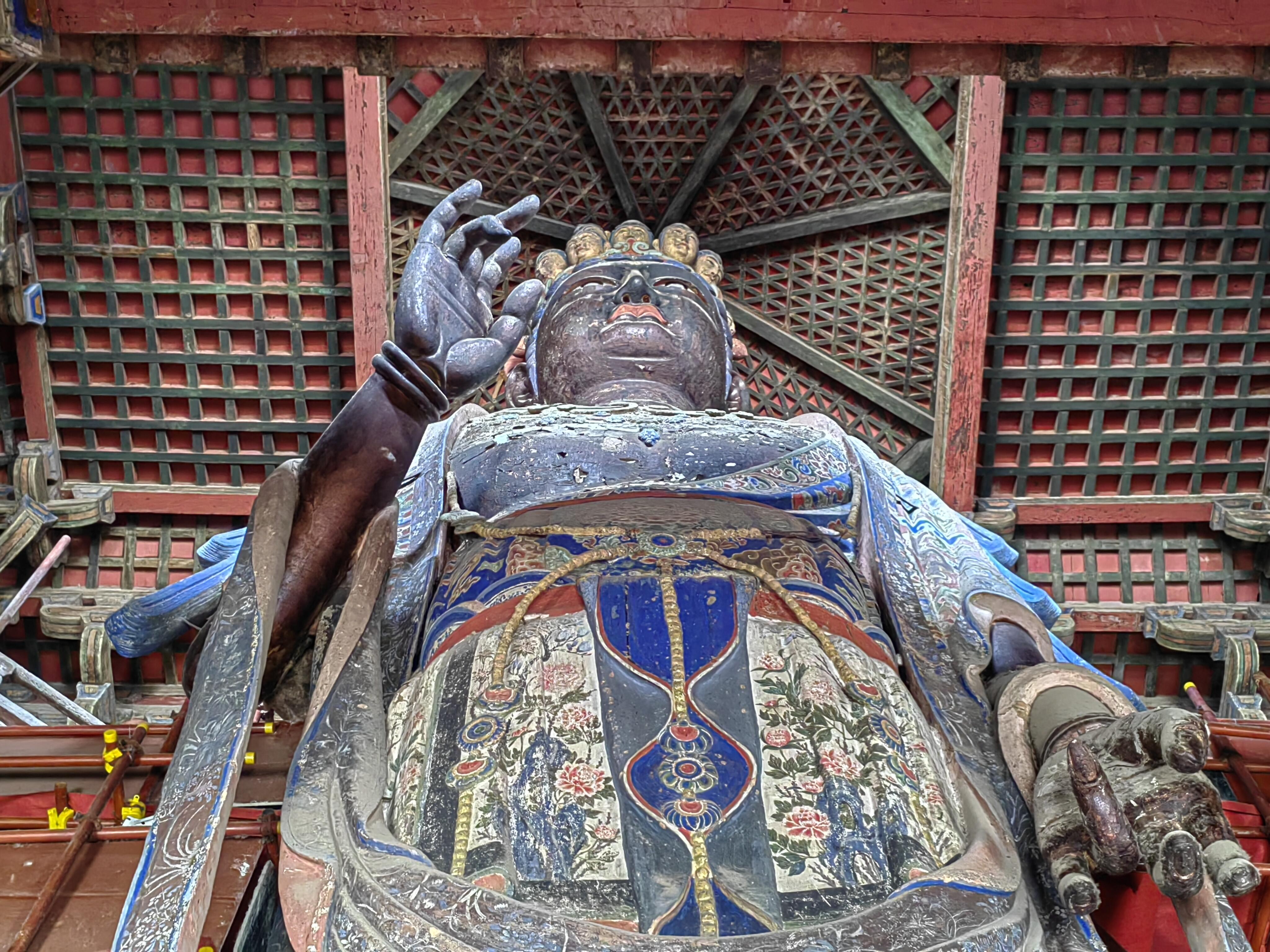 我们沿着吱呀作响的木楼梯,小心翼翼地往上爬。每上一层,视野就变化一次,观音像呈现出的姿态和气势也略有不同。从底下仰望,是绝对的威严和压迫;到了中层平坐,能与观音的胸部平齐,感受那衣纹的起伏和手臂的动势;到了顶层,则几乎能与那十一张面孔对视,更能看清那精美繁复的藻井。