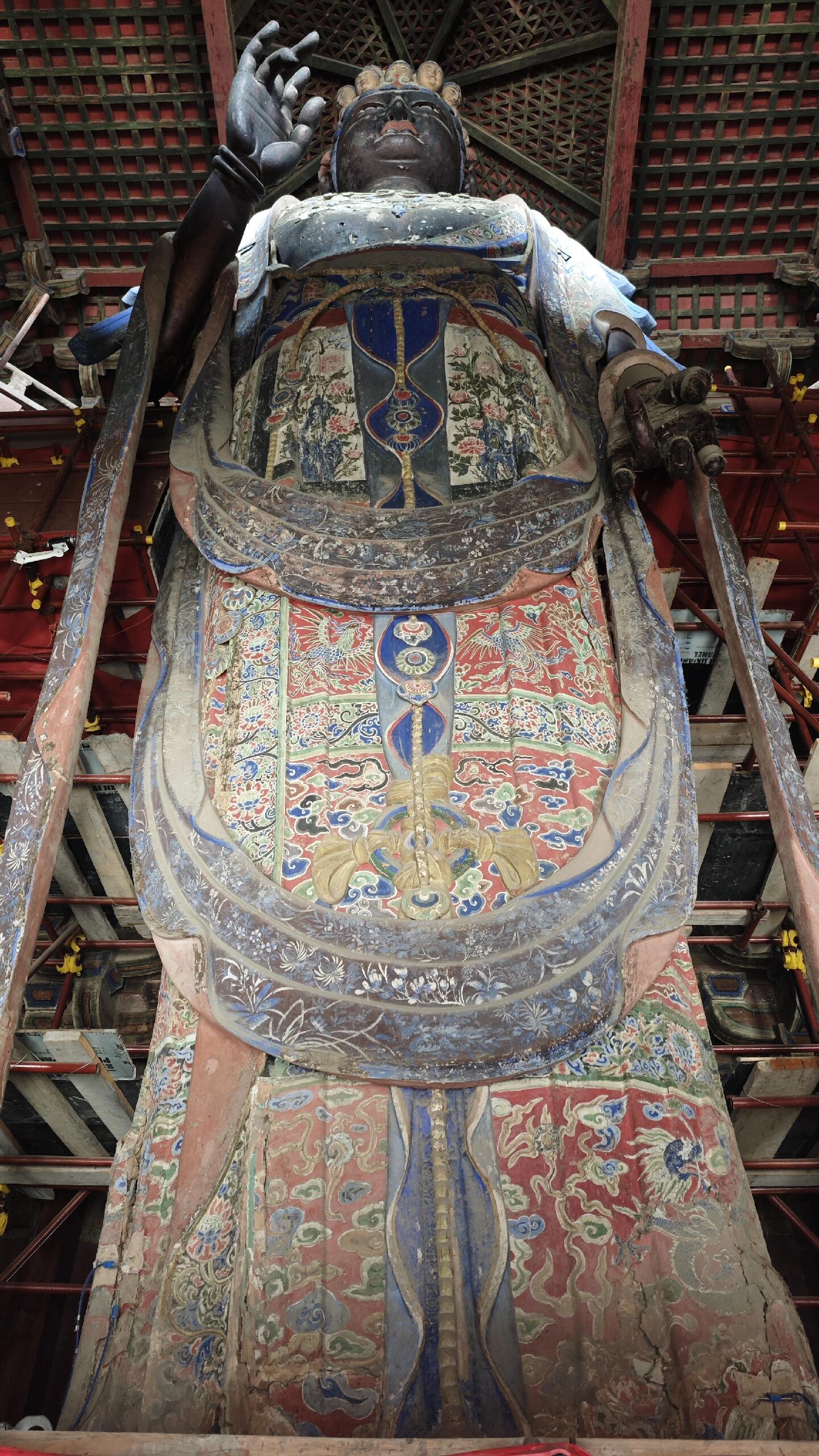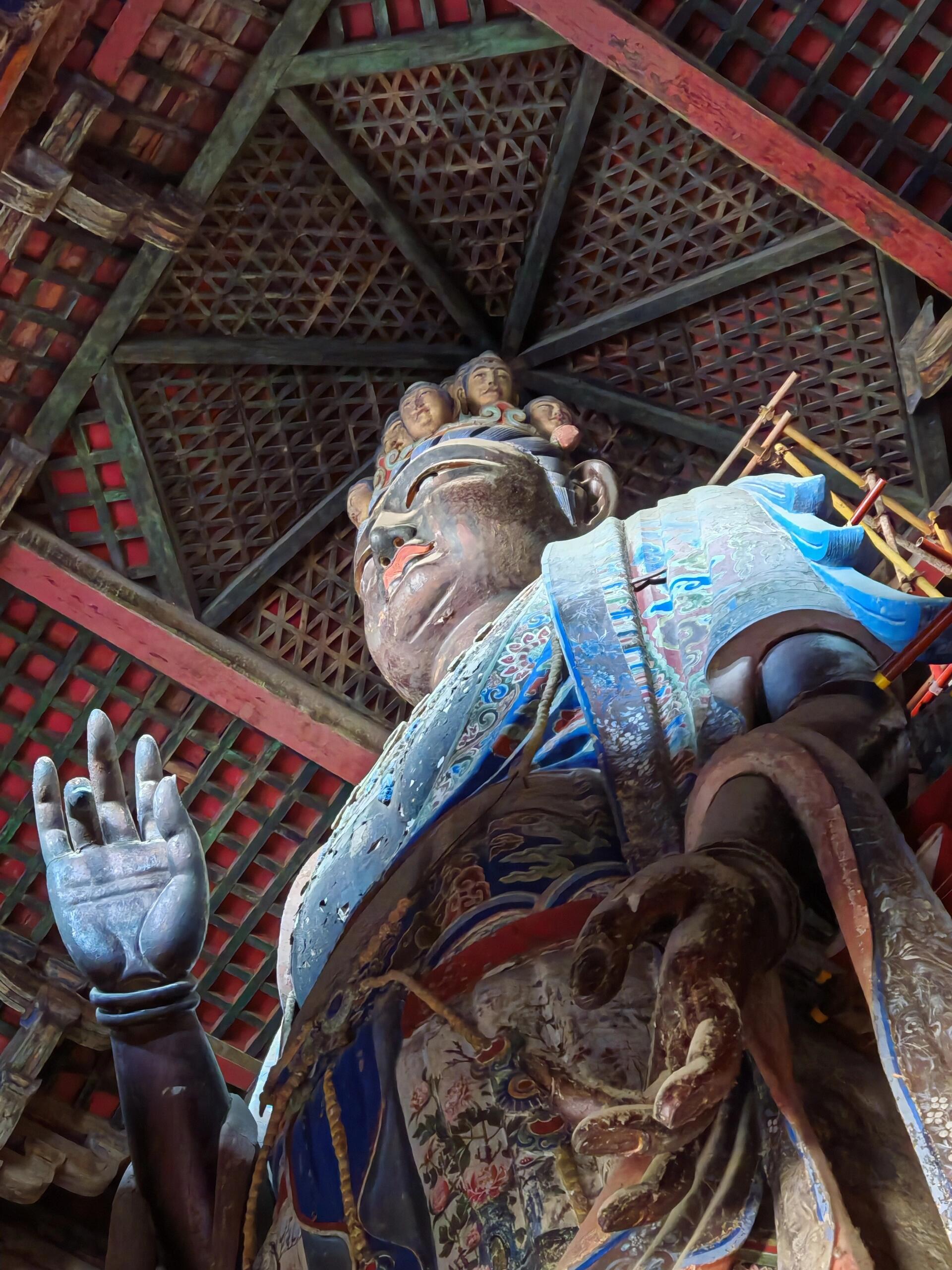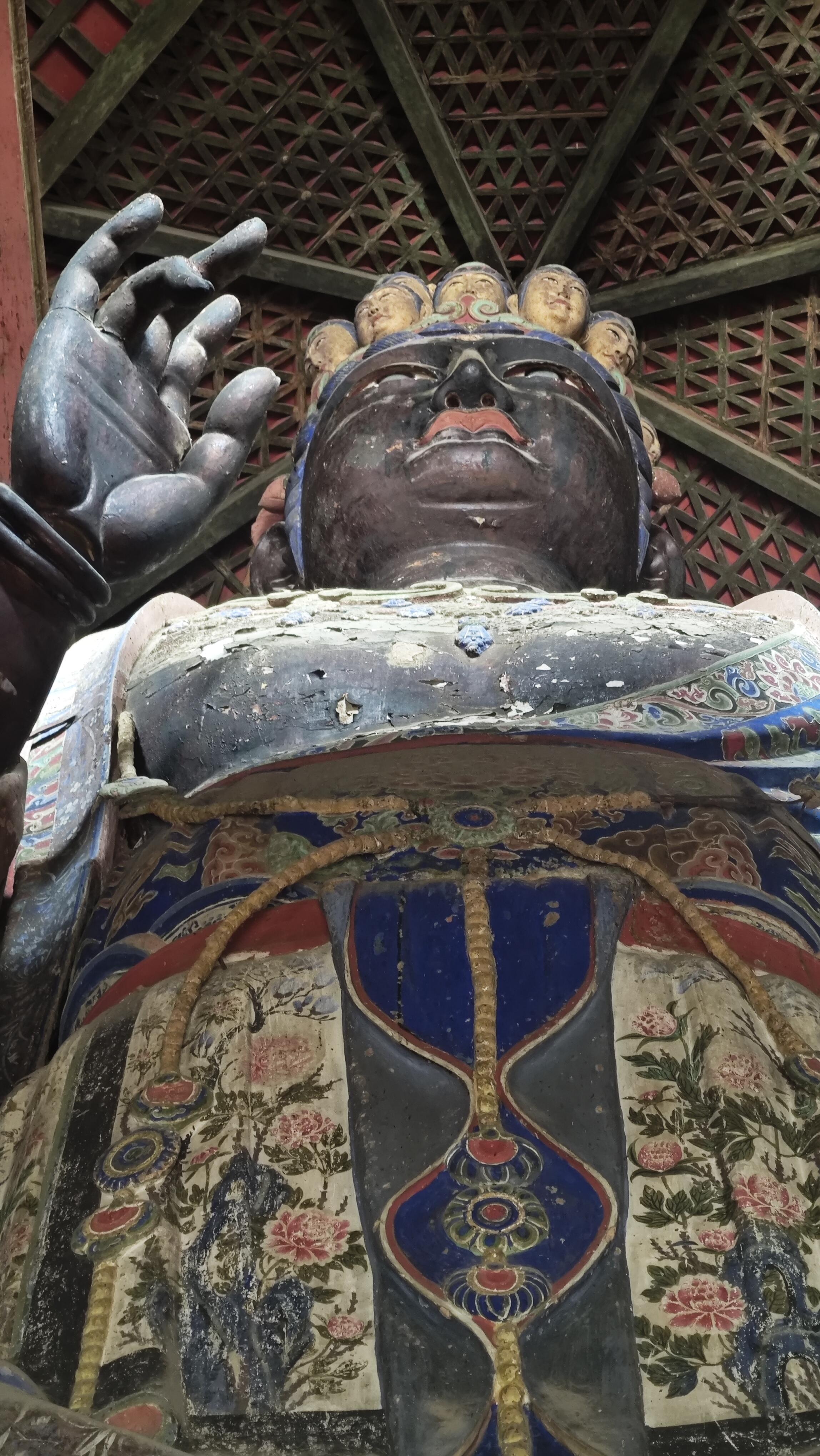 它太高大了,巍然矗立在阁楼中心的空井之中,头部直达三层藻井之下,我们需极力后仰脖颈,才能勉强望见那慈悲垂眸的面容。身躯微微前倾,仿佛正从云端俯视众生,带着一种无言的压力和悲悯。四十二只手臂(部分为后期修复)在身体两侧次第展开,如同巨大的翅膀,又像是绽放的千瓣莲花,每一只手掌都姿态各异,持有不同的法器。尽管色彩已经斑驳黯淡,泥胎也有剥落,但那流畅的衣纹线条,那静穆庄严的神态,尤其是那十一张面孔(正面三张慈悲相,头顶七张忿怒相或菩萨相,再加一面在发髻顶端)所构成的复杂而和谐的视觉冲击,足以让任何站在它脚下的人,心生战栗,忘却言语。