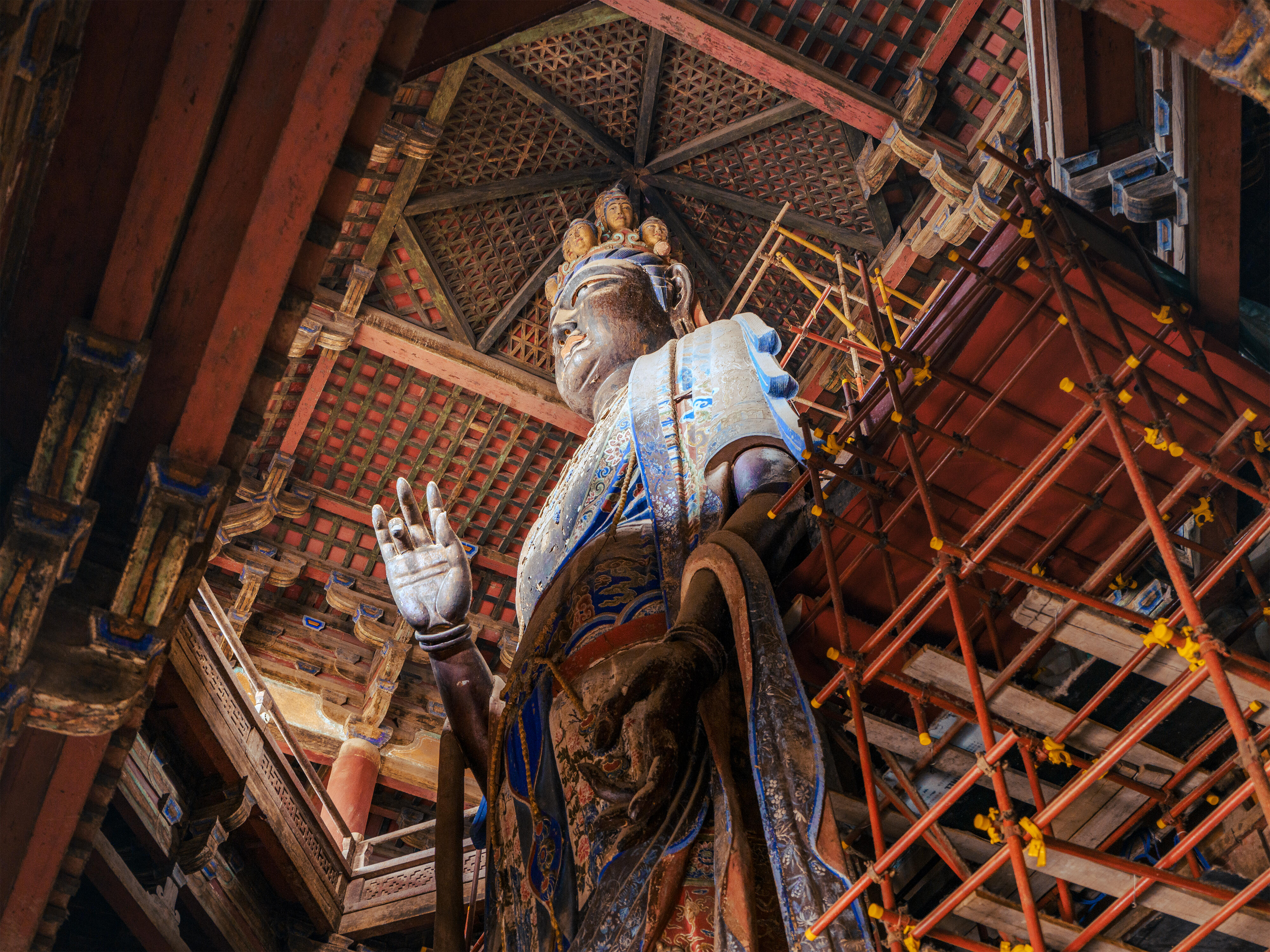 我的目光从观音像上移开,开始打量这支撑起如此巨像的木结构空间。内部是空筒式结构,为了容纳观音像,取消了多数楼层板,形成了一个贯通三层的巨大空间。四周是逐层内收的带平坐的走廊,我们可以沿着陡峭的木梯攀爬,从不同高度瞻仰观音。