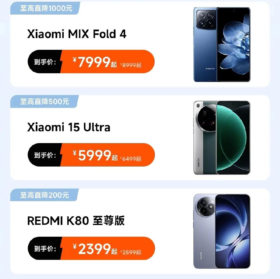 从产品布局来看,小米此次双十一几乎覆盖了“人车家全生态”所有核心品类。手机方面,折叠旗舰MIX Fold 4直降1000元,小米15 Ultra降价500元,Redmi K80至尊版也优惠200元,价格进一步下探至2399元起。这些机型多数是今年发布的新品,尤其是小米17系列在国庆期间已实现销量爆发,此时降价无疑将再度拉动换机潮。