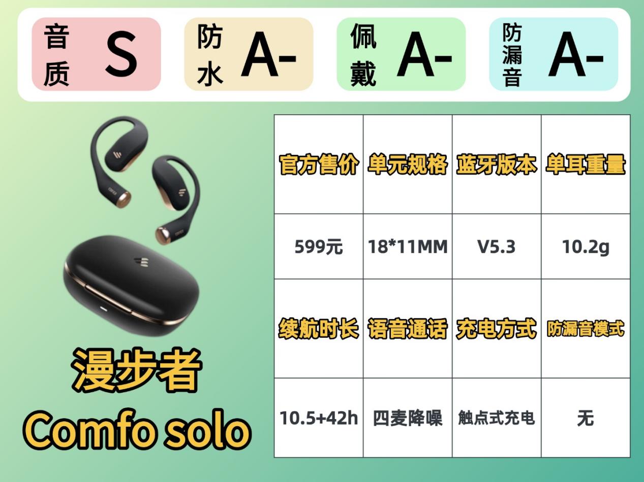 漫步者在音频领域深耕多年,在开放式耳机品类里,也算是有一定经验的品牌。这款 Comfo solo 更侧重用户的听觉体验和日常使用适配,在音质表现和续航能力上做了优化,适合看重听歌、看剧体验,且需要长时间使用耳机的人群。