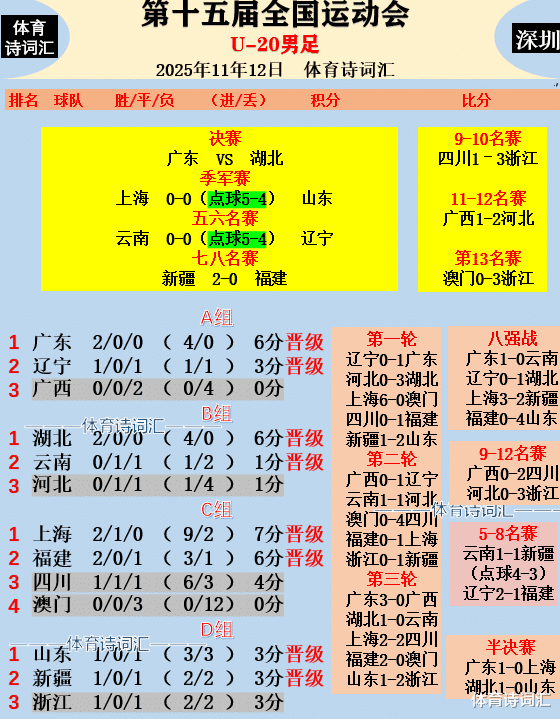 全运会男足最后一个项目,20岁以下组今天迎来最后一个比赛日的争夺,在下午进行了3-13名的名次争夺战,晚上则由东道主广东迎战湖北,两队争夺赛事冠军,也是足球项目里最受关注的一场比赛。