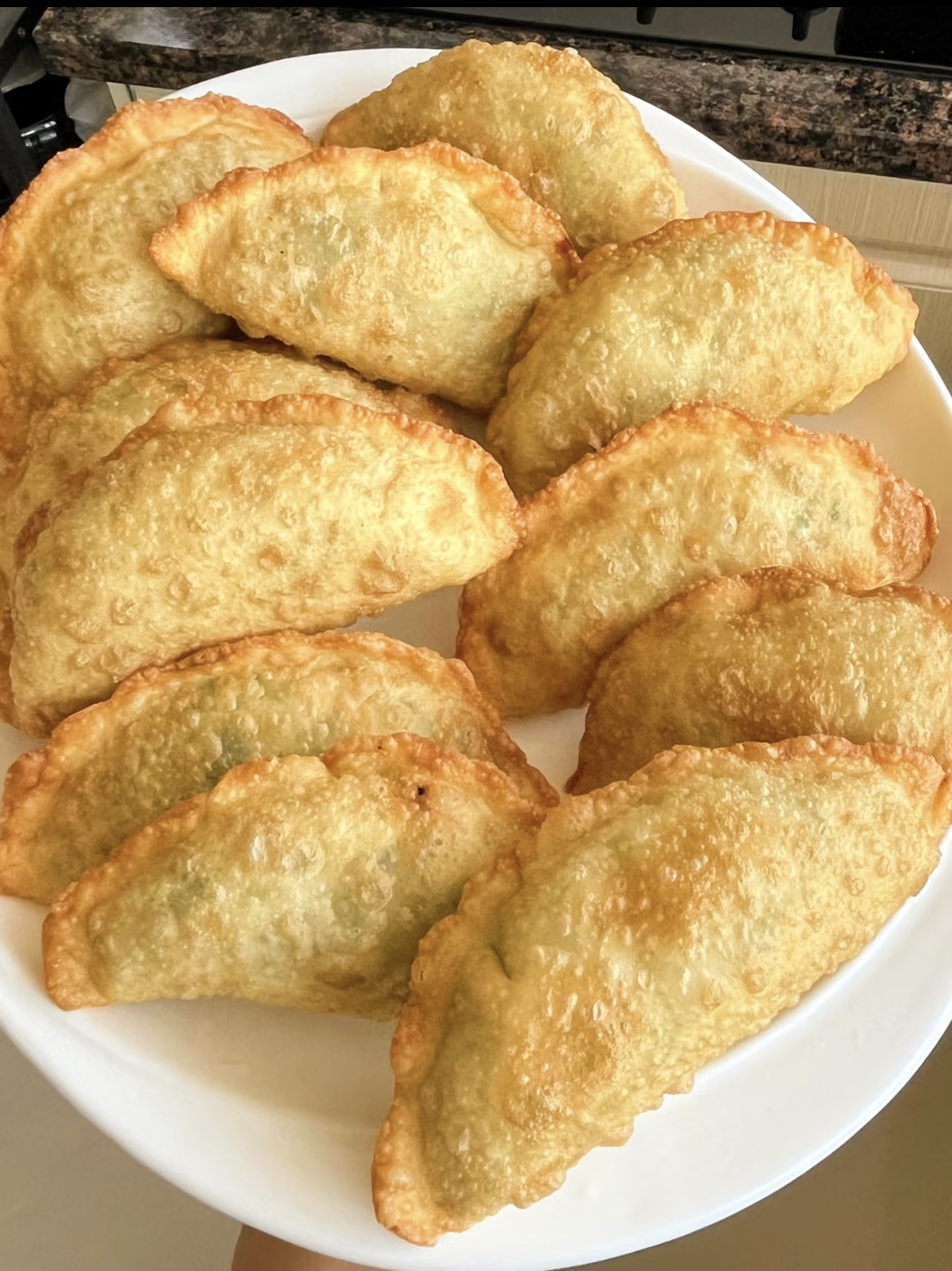 面皮的做法同样简单,不用发酵,现做现包最省事。盆里倒入500克普通面粉,缓缓加入250毫升左右的温水,一边倒一边用筷子搅拌成絮状,再下手揉成光滑的面团。面团揉好后不用醒发,直接搓成长条,分成大小均匀的小剂子,每个剂子擀成中间厚、边缘薄的圆面皮,这样包的时候底部不容易破。取一张面皮,放上满满一勺馅料,对折捏紧边缘,再用手指捏出一圈漂亮的花边,一个圆滚滚的炸菜角就包好了,花边不仅能锁住馅料,炸出来还格外好看。