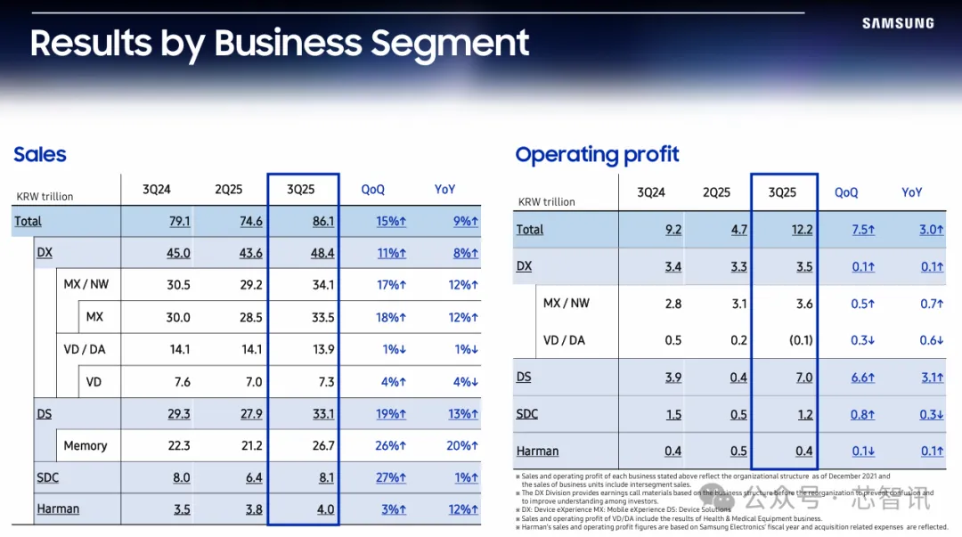 其中,2025 年第三季度,由于旗舰智能手机销售强劲,以及 Galaxy Z Fold7 的强劲推出以及平板电脑和可穿戴设备销量的改善,MX 业务的销售额和营业利润环比和同比增长。
