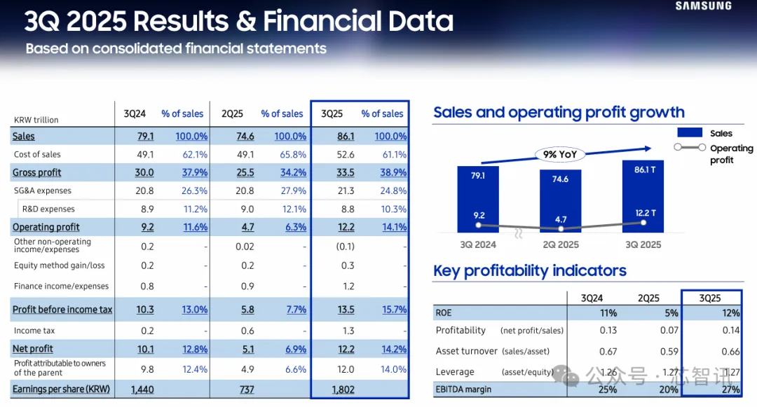 10月30日,三星电子正式公布了截至 2025年9月30日的第三季度财报,合并销售额为86.06万亿韩元(约合606亿美元),同比增长8.8%,环比增长15.4%;营业利润12.16万亿韩元(约合85.6亿美元),同比增长32.2%,远超分析师预期的10.1万亿韩元;净利润达到12.22万亿韩元(约合86亿美元),同比增长21%。