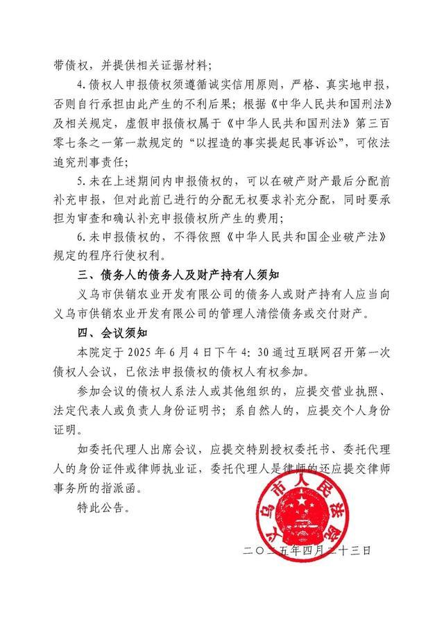 义乌市供销农业开发有限公司破产清算案公告 义乌市人民法院 2025年04月27日