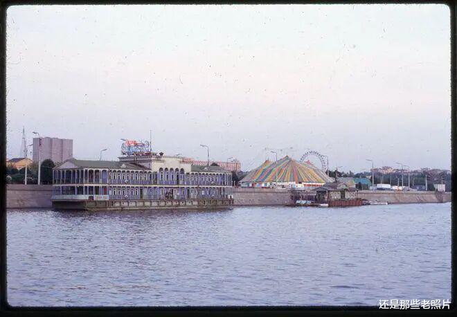 莫斯科河上的浮动餐厅与岸边的游乐园。画面左侧是一艘蓝白相间的两层浮动餐厅,带有拱形窗与柱廊装饰,风格复古优雅,船身可见俄语标识。这类水上餐厅是莫斯科河上的经典休闲场所,为市民提供餐饮与观景服务,是苏联时期中产阶级休闲生活的象征。右侧是一座彩色条纹马戏帐篷,背景可见摩天轮轮廓,构成了典型的城市游乐园场景,是当时莫斯科市民家庭休闲、娱乐的重要去处。