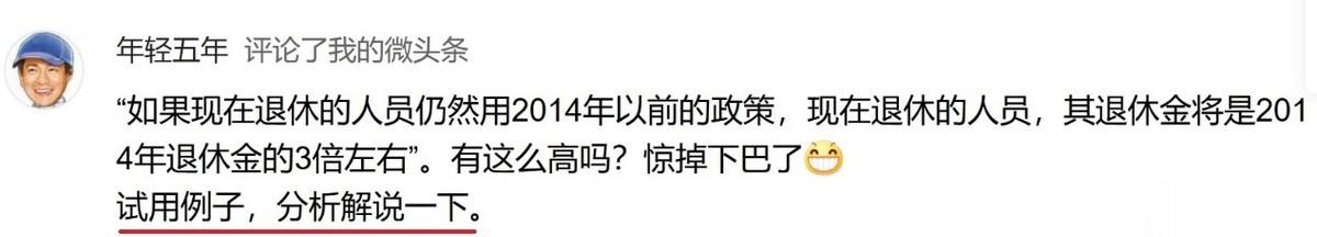 “如果现在退休的人员仍然用2014年以前的政策,现在退休的人员,其退休金将是2014年退休金的3倍左右。有这么高吗?惊掉下巴了