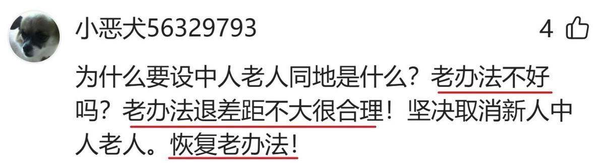“为什么要设中人、老人?老办法不好吗?老办法退休金差距不大很合理!坚决要求取消新人、中人、老人。恢复老办法!”