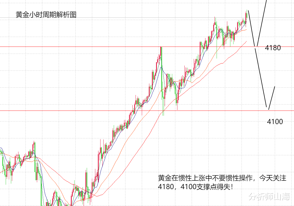 现在的交易要放平心态,虽然看涨趋势比较明显,但实际看涨交易则有点难以跟上,如果是开盘直接上涨,就很难跟多,除非直接做多,这种交易很冒险但适合现在的行情,如果是等调整做多,每天预测的点位能到做多固然没有问题,但是到不了就需要根据盘中变化,做实时交易。周三山海提示支撑在4130附近,但实际开盘直接上涨,很难达到4130,在美盘观察4180支撑有效后,给出了多单,看到了4210,同样也能抓到部分利润。因此,近期行情趋势明显,交易也要讲究方式方法。周四同样要注意是单边上涨走势,还是震荡上涨走势,在趋势明确的条件下,如果是单边走势,那么,可能从早盘就直接上涨到4255,全天就很难追多了,需要取中间点位交易,如果是震荡走势,下方的支撑依旧在4180,就可以等待回落做多。从目前技术面来看,早盘小幅上涨,但不建议追多,日内技术面的支撑在4180附近,回落这个价位做多相对稳健,上涨就看4255,当然不能猜顶,但周四是一周变盘的时间节点,如果意外出现较大调整空间,下方则可以看到4130,4100(心存敬畏之心,谨防这种行情出现)