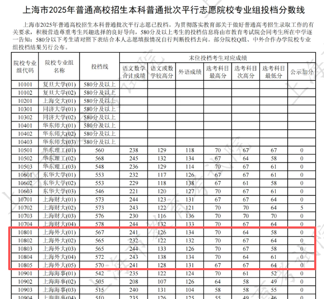 从2025年上海本科普通批次投档数据来看,上外5个院校专业组投档线集中在565-578分区间,远超上海本科线505分,稳居本地高校中上游水平。