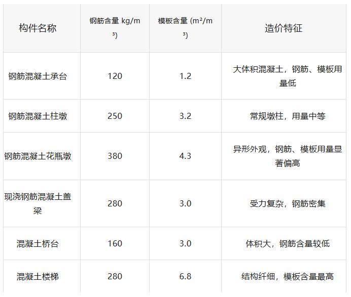 模板含量直接反映构件的外形复杂度和施工难度。混凝土楼梯以6.8 m²/m³遥遥领先,几乎是承台(1.2)的5.7倍。这是因为楼梯有踏步、斜板、平台等多折面,无法采用大块定型模板,需大量木模拼装,人工和材料成本陡增。花瓶墩模板含量4.3,同样明显高于普通柱墩(3.2),其曲线或棱形截面导致模板需要特制或弯曲加工。盖梁与桥台均为3.0,属于中等水平,可采用常规钢模或木模。承台模板含量最低,因其几何规则、体积大,每立方米混凝土分摊的模板面积很小。