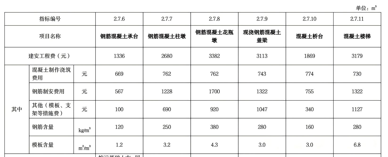 桥台:1869元/m³,指标居中,包括模板及支架安拆、混凝土浇筑、 钢筋制安,但不含支架基础处理;