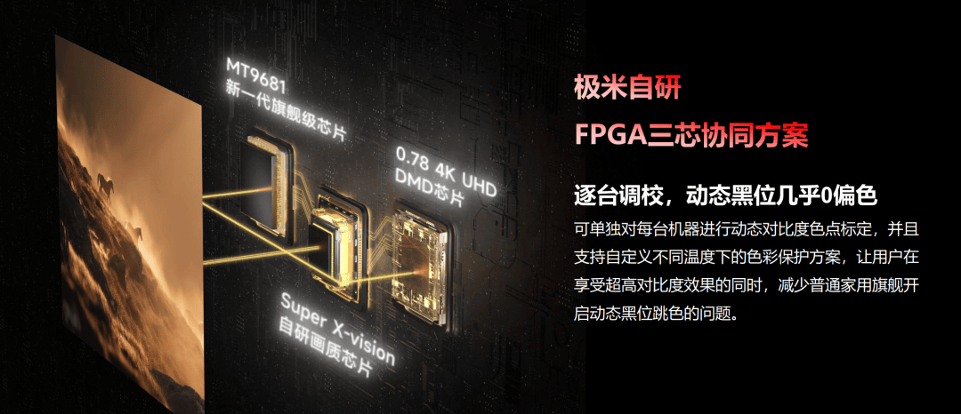 这三套核心硬件分别是 0.78DMD 成像芯片、旗舰级 MT9681 主控芯片,以及深度定制的 Super X-Vision 独立画质芯片。现场的技术演示让老马印象深刻:播放老电影修复片段时,MT9681 的 AI 画质单元会逐帧降噪,原本模糊的人脸轮廓立刻清晰起来;而独立画质芯片则像 “专职调色师”,实时优化色彩与对比度。更关键的是,这三者不是各自为战,极米自研的 FPGA 三芯协同方案让它们形成了联动。