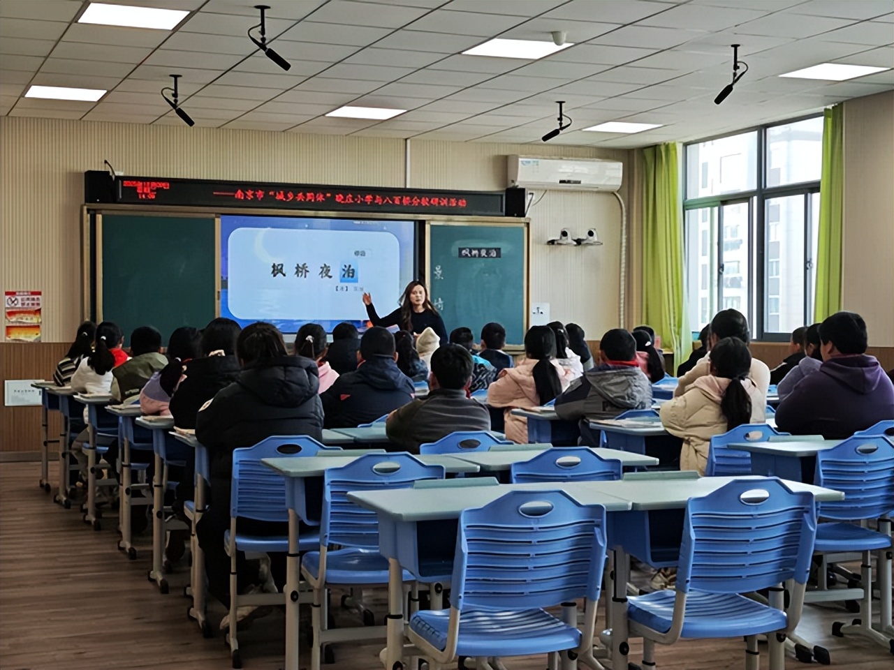 活动现场,三节精品古诗文课依次呈现,各显特色、扎实高效。六合区实验小学八百桥分校梁雯倩老师执教二年级《敕勒歌》,以情境导入唤醒兴趣,结合诵读识字夯实基础,搭配图文相辅具象意境,带领学生沉浸式领略草原壮阔风光,课堂趣味与实效兼顾。孙辉老师执教四年级《出塞》,锚定小班制合作学习优势,创设“边塞诗境”互动场景,引导学生通过小组研读析诗意、诵读展演悟情怀,在协作探究中深化家国担当认知。晓庄小学崔兴老师执教五年级《枫桥夜泊》,围绕“解诗意、绘诗画、品诗情、悟诗愁”主线,依托小组分工、对比阅读等方法,引导学生深入诗境体悟客愁,在小班制高效互动中实现从文本解读到情感共鸣的深度跨越。