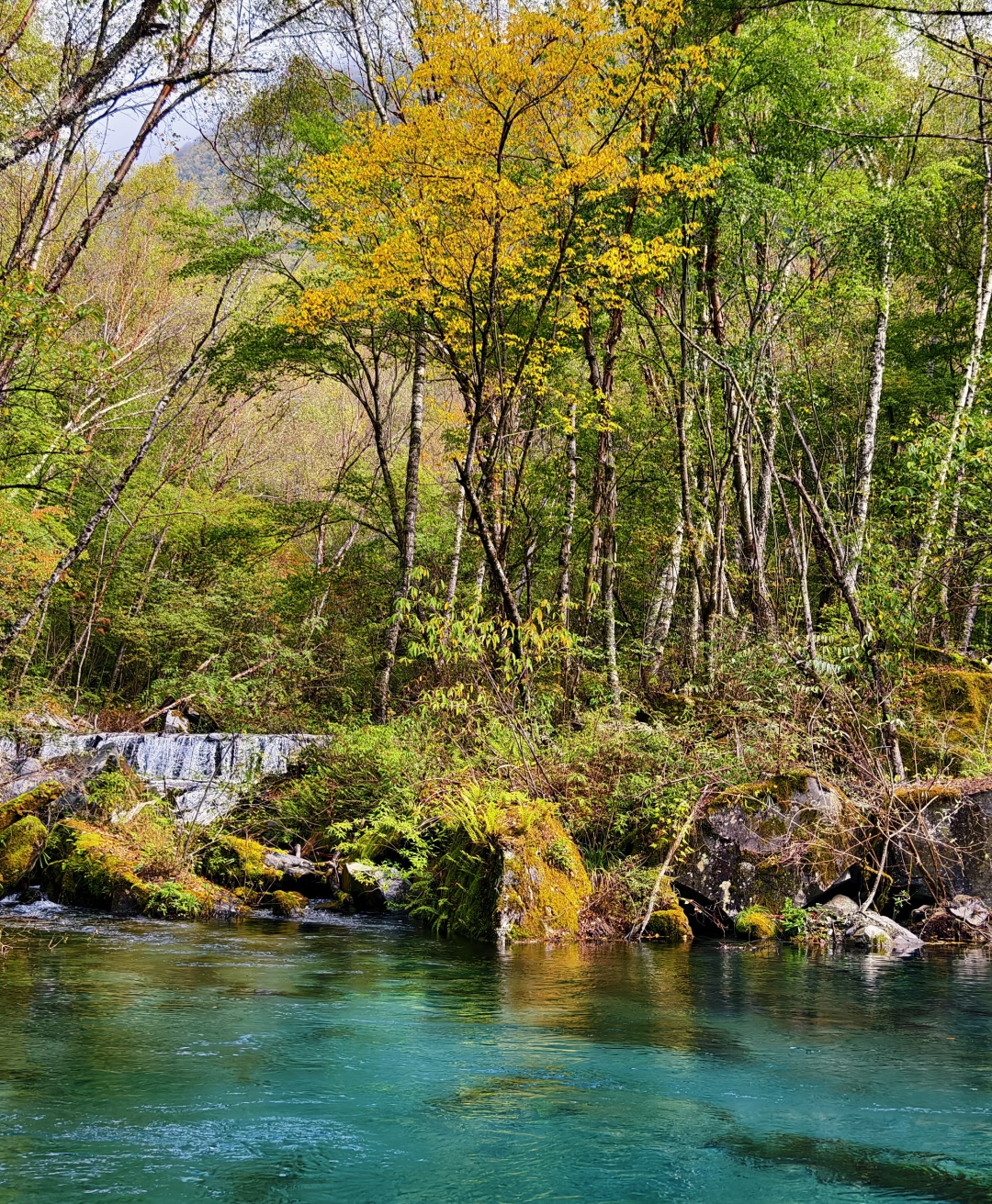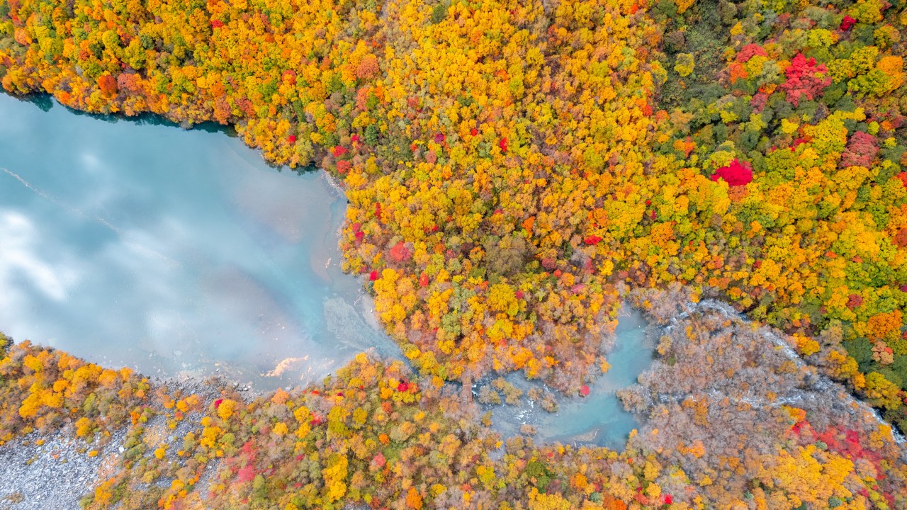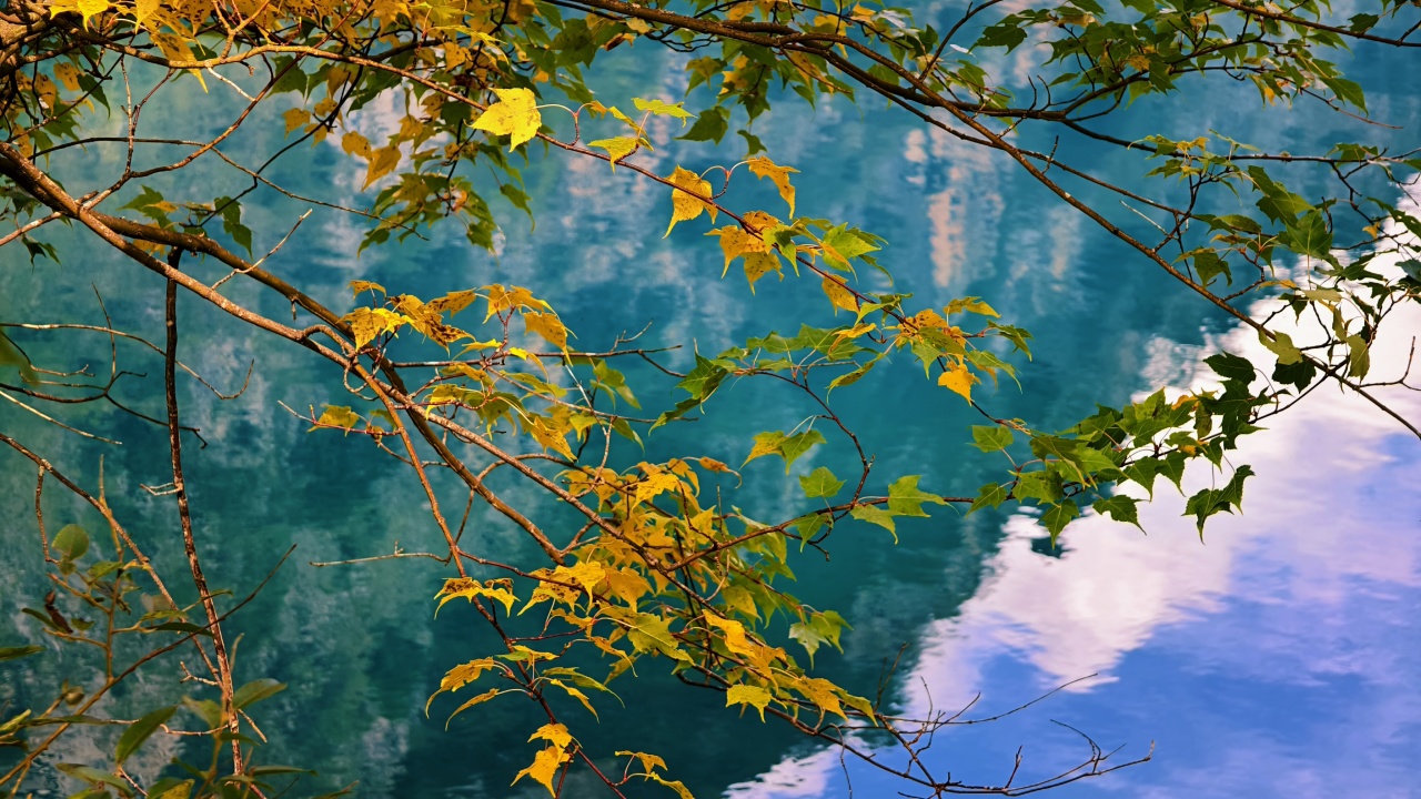 长海的碧蓝与彩林的绚烂形成鲜明对比