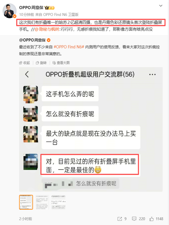 在OPPO Find N6内测用户的使用反馈中,大家对这次新机的折痕控制更是给予了一致好评,称其是“目前折叠屏最佳”! 搞得我现在是愈发好奇,Find N6的这个折叠顺滑度,以及内屏的平整度,是不是已经能媲美直板机了?
