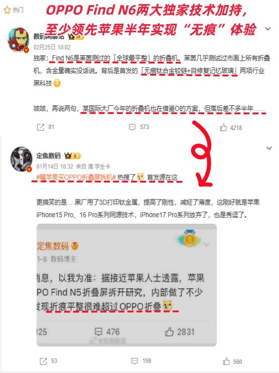 根据站哥的透露,Find N6能做到“几乎无折痕”的原因,主要得益于「无痕钛合金铰链+自修复记忆玻璃」两项行业黑科技,而某国际大厂今年的折叠机也在借鉴O的方案,但落后差不多大半年!(没错,苹果说的就是你👀)