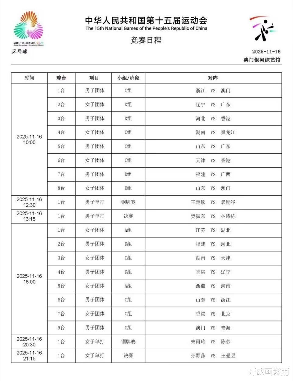 全运会乒乓球奖牌之战开打,2025年11月16日赛程出炉,央视CCTV5直播,咪咕体育直播。