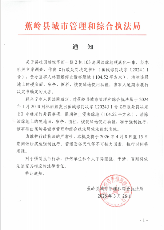 2026年3月26日,蕉岭县城综局向林某发出书面《通知》,明确告知:经兴宁市人民法院裁定,对《行政处罚决定书》(蕉城综罚决字[2024]1号)中确定的“限期停止侵害绿地,清除硬地面、凉亭、围栏,恢复绿地使用功能”事项,准予强制执行,并由城综局依法组织实施。执行时间定于2026年4月8日至15日期间,如遇恶劣天气等不可抗力因素将顺延。
