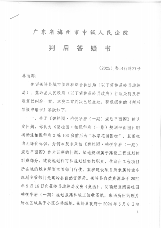 事件的源头可追溯至2023年。蕉岭县城综局认定林某擅自占用小区公共绿地并硬化,对其作出罚款及责令恢复绿地的行政处罚。林某不服,认为购买房屋同时签订花园使用协议,其拥有花园的专属使用权,花园使用自始合法且与规划报建图纸、开发商宣传图册用途相符。当事人基于对政府的信赖回家投资,依法应受保护,当事人坚称城综局在越权执法,破坏营商环境,双方争议经行政复议、一审及二审诉讼,最终行政判决生效。在此过程中,城综局曾于2023年4月25日就该行政处罚举行了听证会。2025年12月,林某因计划申请再审,向城综局提交政府信息公开申请,要求获取该次听证会的“听证笔录”及“全过程的现场视频及音频记录原始载体”。