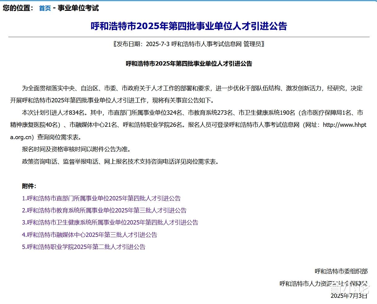 近日,呼和浩特市人事考试信息网发布《呼和浩特市2025年第四批事业单位人才引进公告》,本次计划引进人才834名。