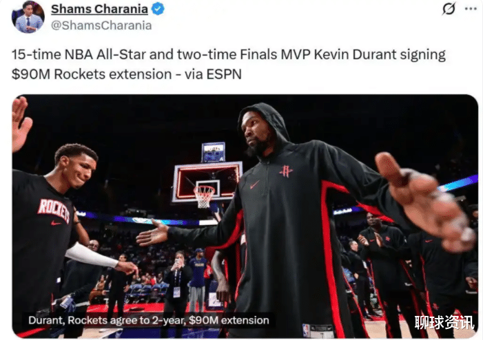 据Shams报道,凯文-杜兰特与火箭达成2年9000万续约合同,其中27-28赛季为球员选项。